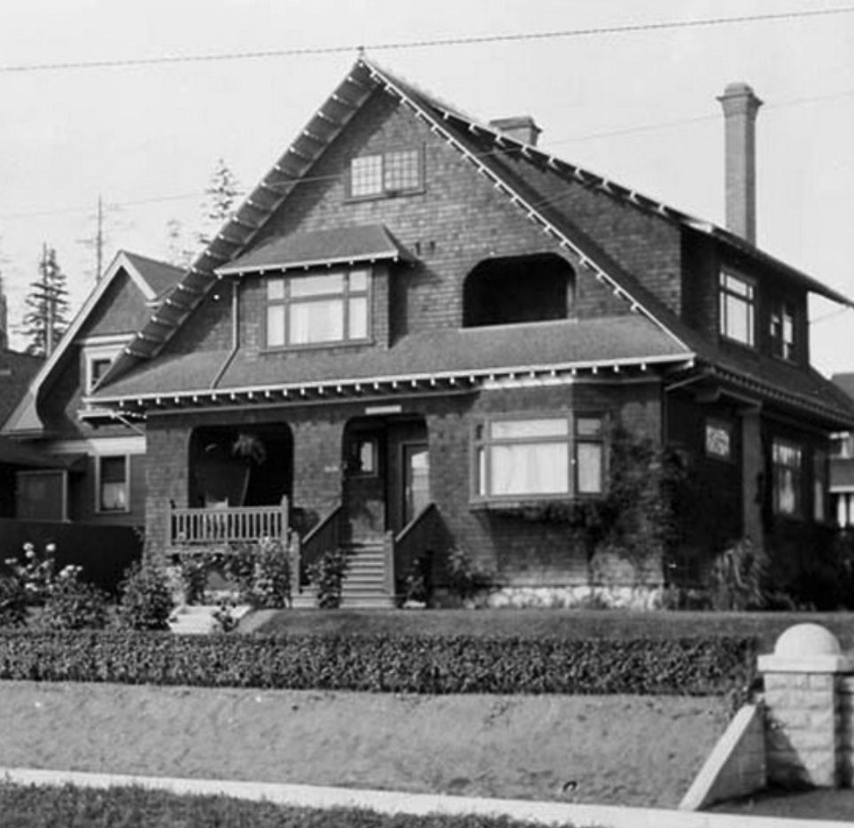 この敷地の歴史を遡ると、現在の構造物が建設される以前、1907年には壮麗な邸宅が存在していました(右写真参照)。建築様式はクイーン・アン・リバイバル(Queen Anne Revival)。当時のバンクーバーのエリート層に好まれたスタイルであり、以下の特徴を備えたヘリテージ建築でした。